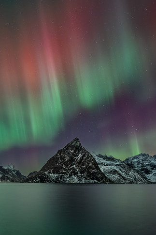 Farben, die wir noch nie gemeinsam auf einer Nordlichter-Aufnahme gesehen hatten, tanzten wie wild über den Himmel. Wir hielten die Belichtungszeiten kurz, um so viele Bewegungen wie möglich, einzufangen. Zum Durchschnaufen blieb praktisch keine Zeit. Über eineinhalb Stunden lang beobachteten und fotografierten wir gespannt das Spektakel am Nachthimmel über den Lofoten.